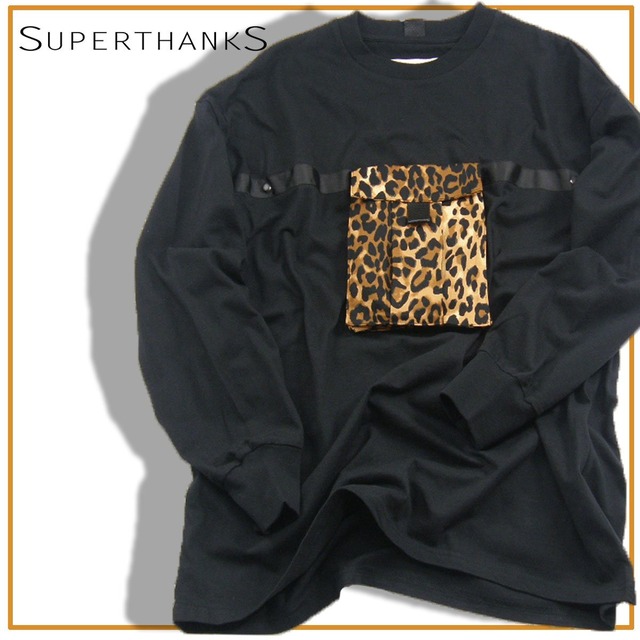 SUPERTHANKS / スーパーサンクス サコッシュ付 ロンT レオパード柄 ポーチ付き 長袖Tシャツ 2WAY ポーチ ポケT 黒 ブラック ヒョウ柄 ユニセックス ロングスリーブ カットソー | 秋冬