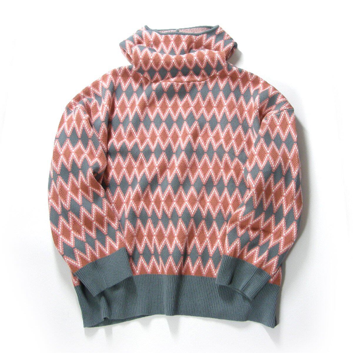 幾何学柄が特徴的なフード付きニットプルオーバー