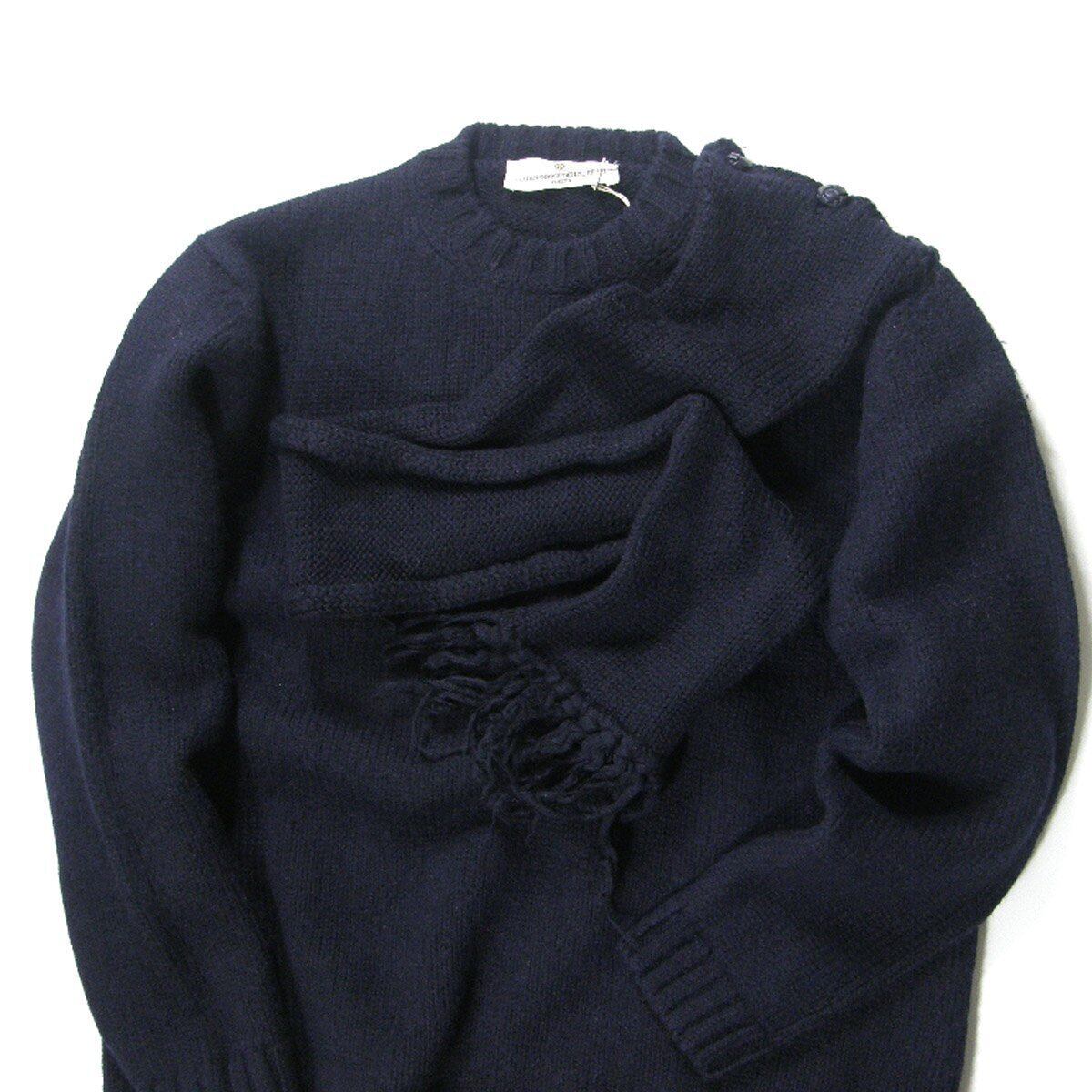 肩に並んだ編み込みボタンがポイントのマフラー付き厚手ニット