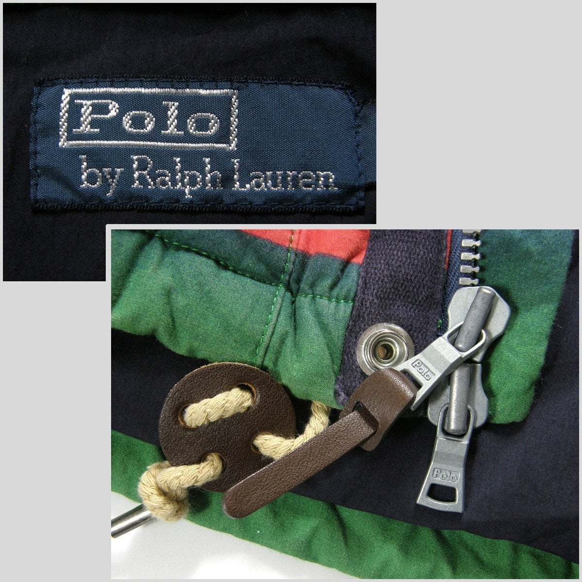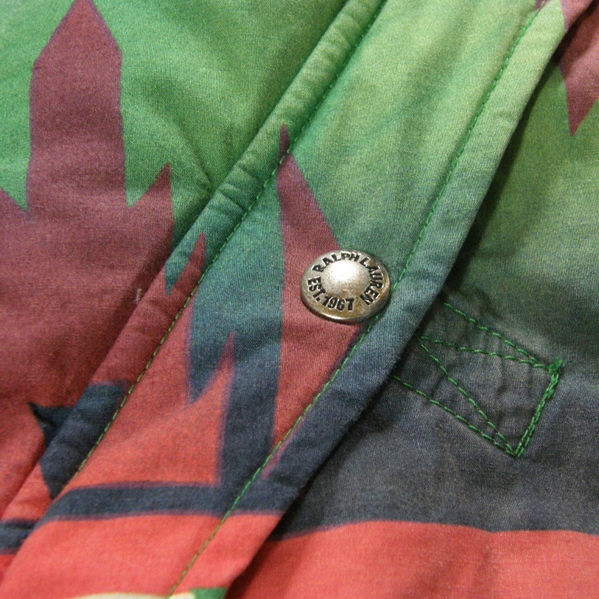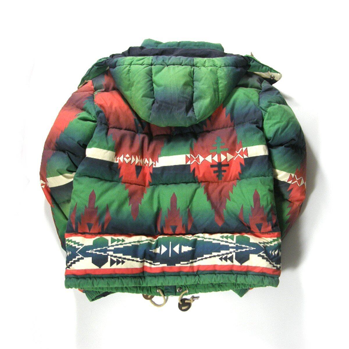 Ralph Lauren / ラルフローレン ダウンジャケット ネイティブ柄 ヴィンテージ加工 ダウンジャケット 取り外し可能 フード付き ネイティブ グリーン レッド レア ビンテージ加工 コットン 牛革 レザー ラルフ ローレン | 秋冬
