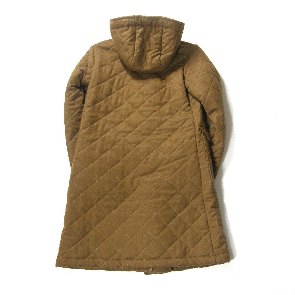 モダンでフェミニンなミドル丈のフーデッドキルティングコート