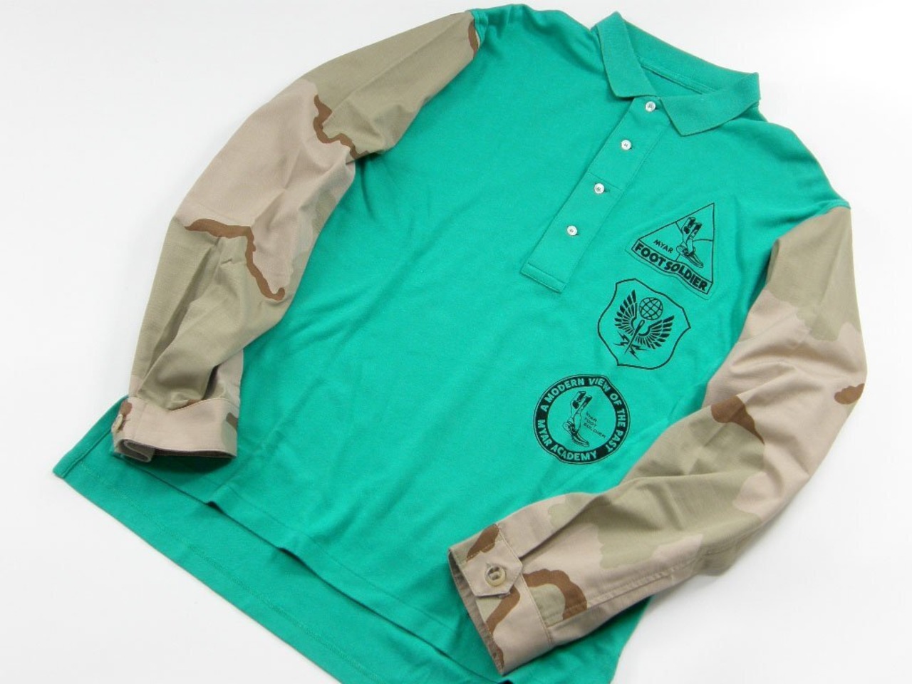 ポロシャツにビンテージミリタリージャケットの袖をドッキングし、アップサイクル