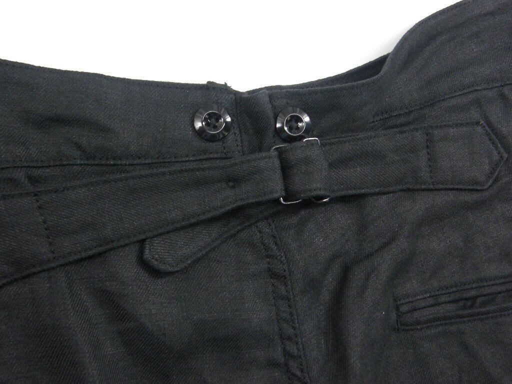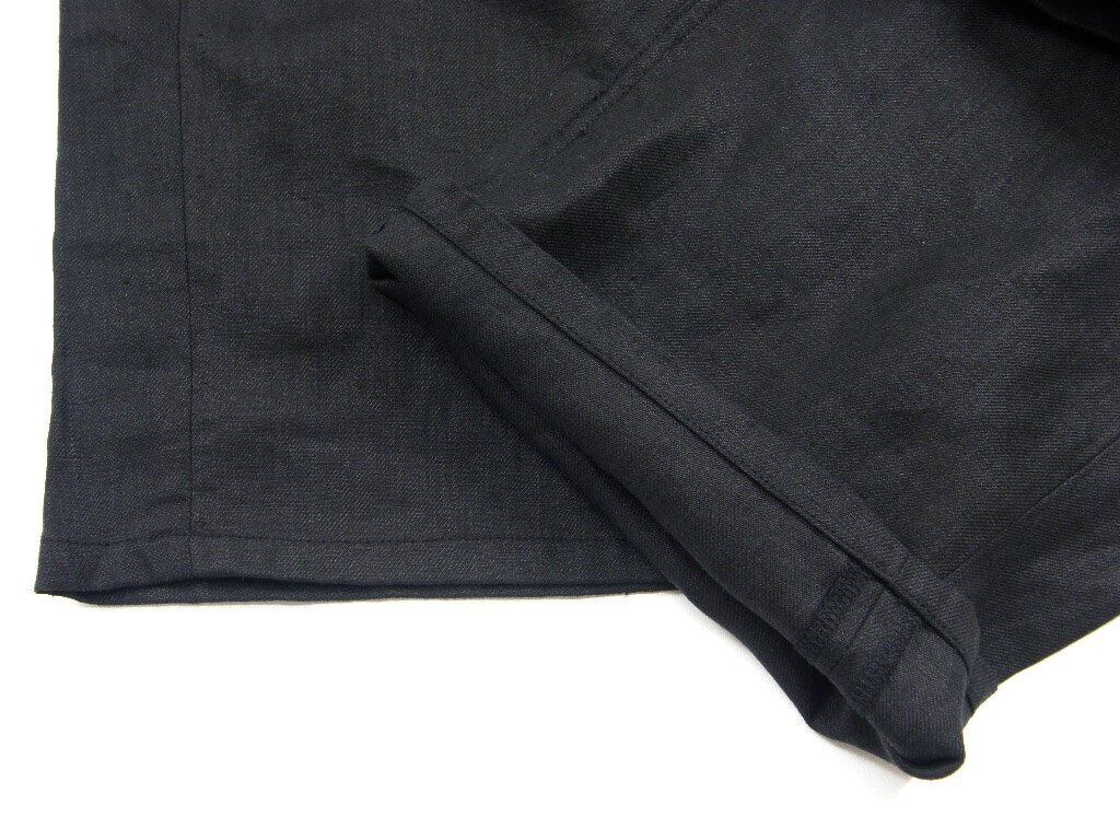 ワタリから膝にかけて大きく広がり、裾にかけては少しテーパードした独特なシルエットですが、サイドシームを脇からやや前にずらすことで、収まりの良いシルエットバランスになっています