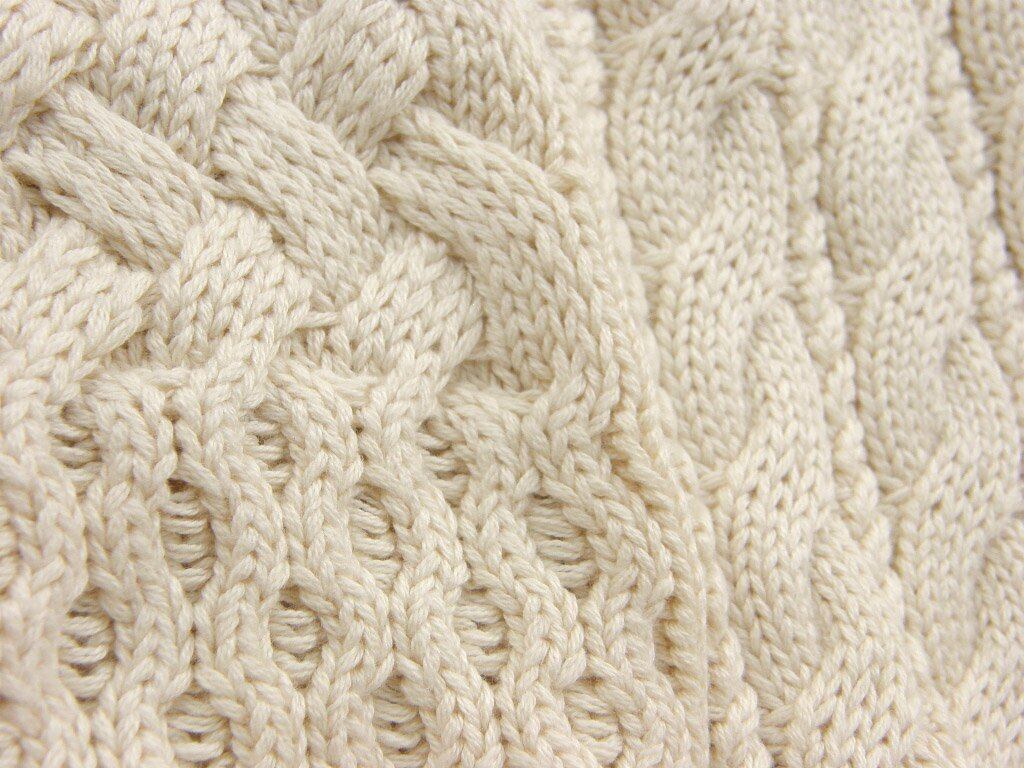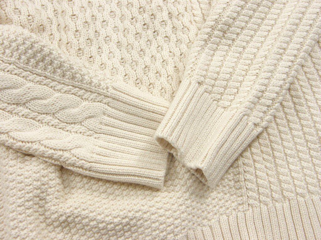 パーツ毎で編み地を変更しており、アランニットを代表する編み柄である「ダイヤモンド・ハニカム」などを網羅した、正にいいとこ取りした1点。