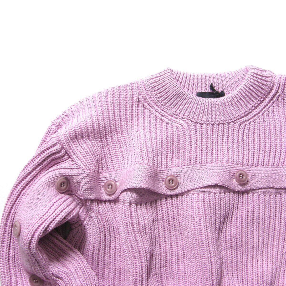 畦編みのシンプルなクルーネックに胸から右腕に掛けて伸びる前立ての様なデザイン